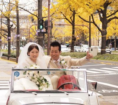 クリスマスムード一色の御堂筋 オープンカーで登場!