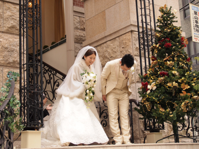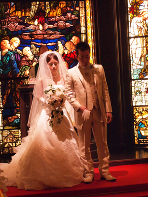 緊張気味のお二人を チャペルの素敵な ステンドグラスの光が 優しく包みます。