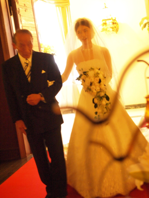 お父様とヴァージンロードを 歩く花嫁さんの ウエディングドレスは、 ロングトレーンの 格調高いデザインです。 プリザーブドフラワーの ガーデンローズやオールドローズ 上質のバラをたっぷり使った キャスケードブーケが とってもお似合いですね。 シルクフラワーの山ブドウと アイビーをあしらって ナチュナルな上品さを 演出しています。
